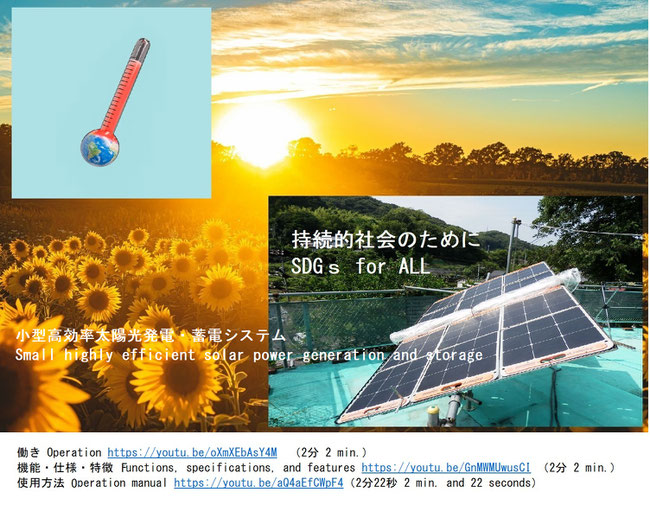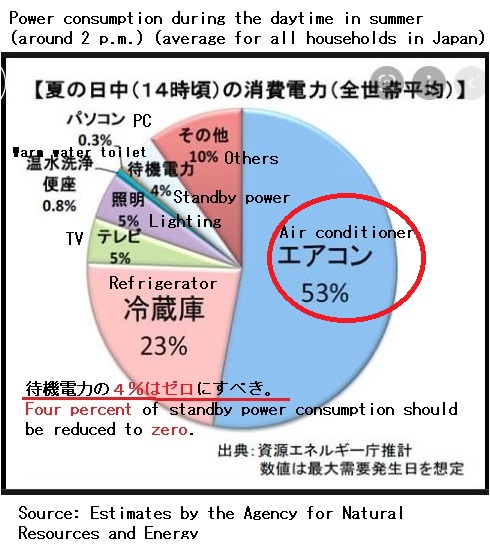 In my home, we use electricity generated by the small highly efficient solar power generation and storage system of my development for air conditioner for about four hours in the afternoon, when its electricity consumption volume becomes bigger during the day in summer.