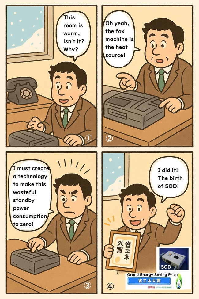 待機消費電力量のゼロ化技術である「節電虫(SOD)」の技術と装置の誕生物語を日本語と英語で簡単な4コマ漫画にしてみました。