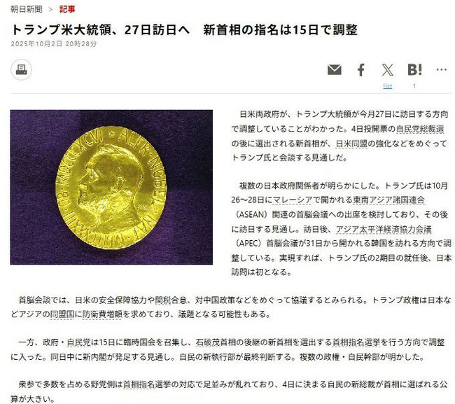 By the way, it has been reported a President who wants the Nobel Prize will be visiting Japan this October.